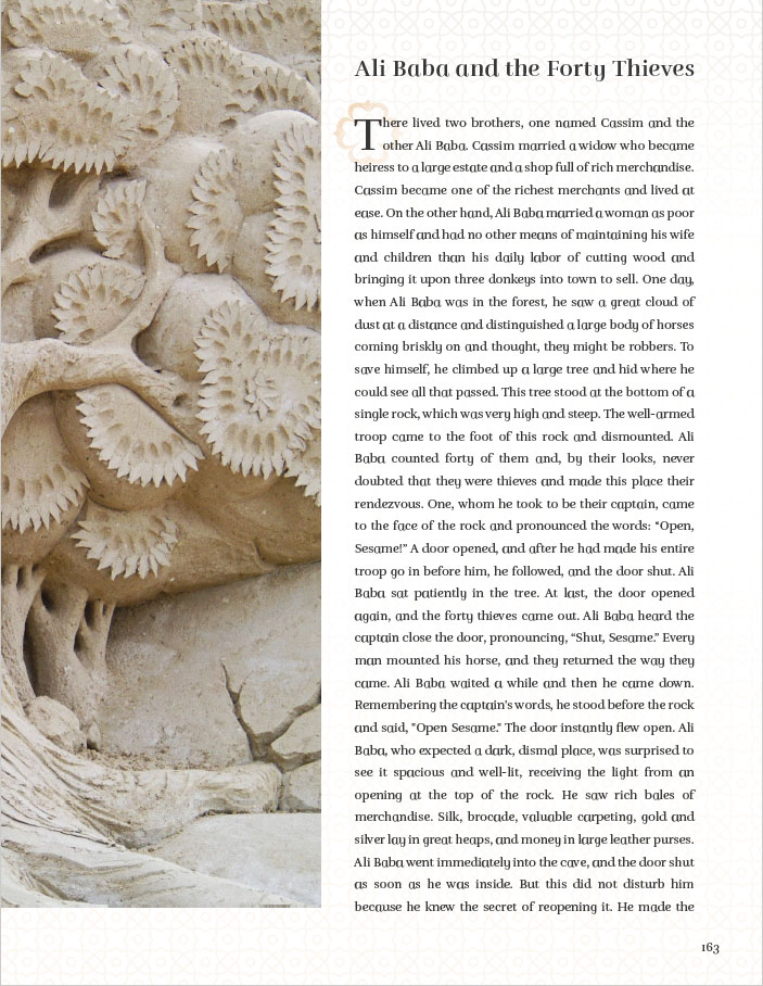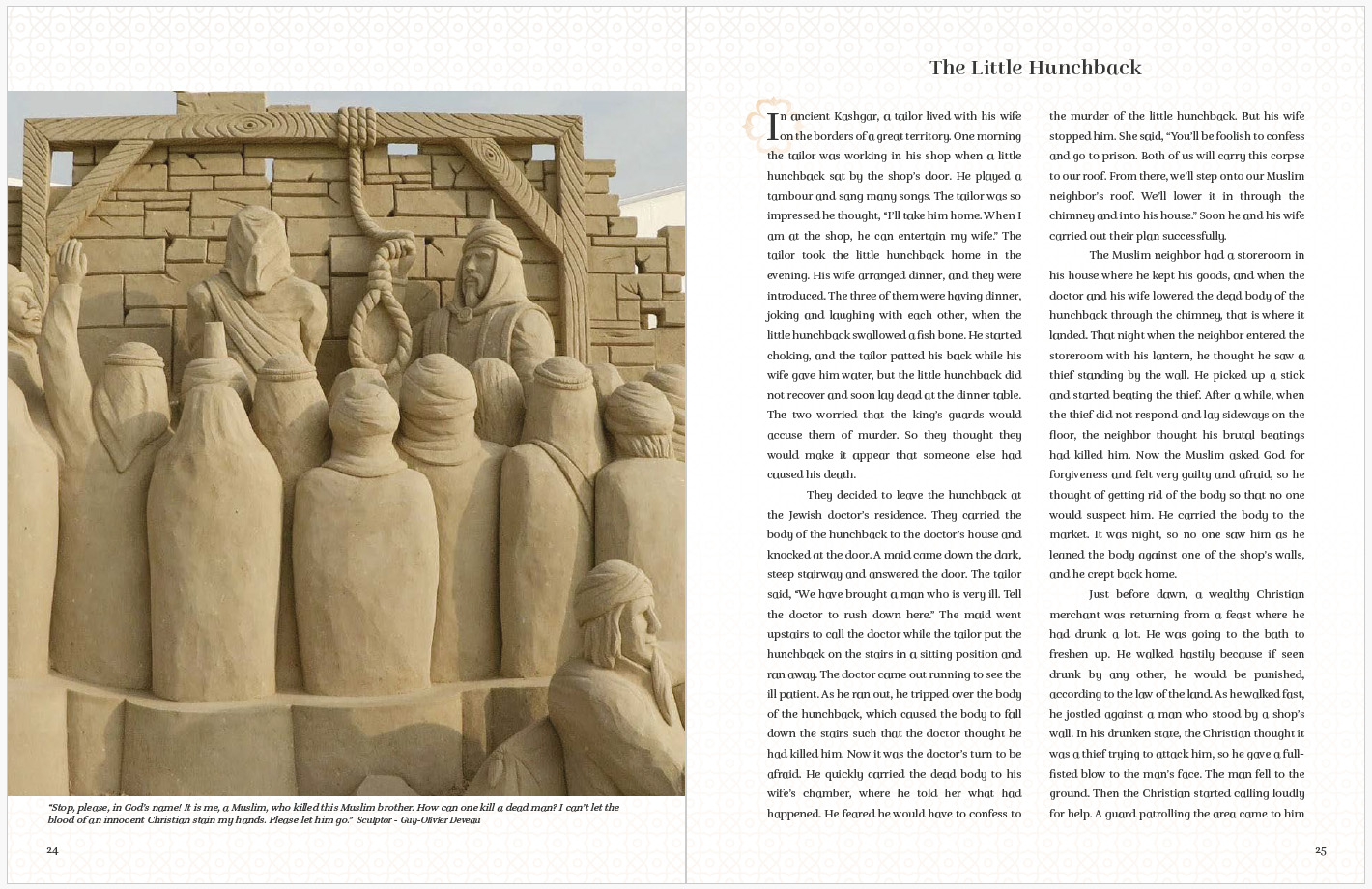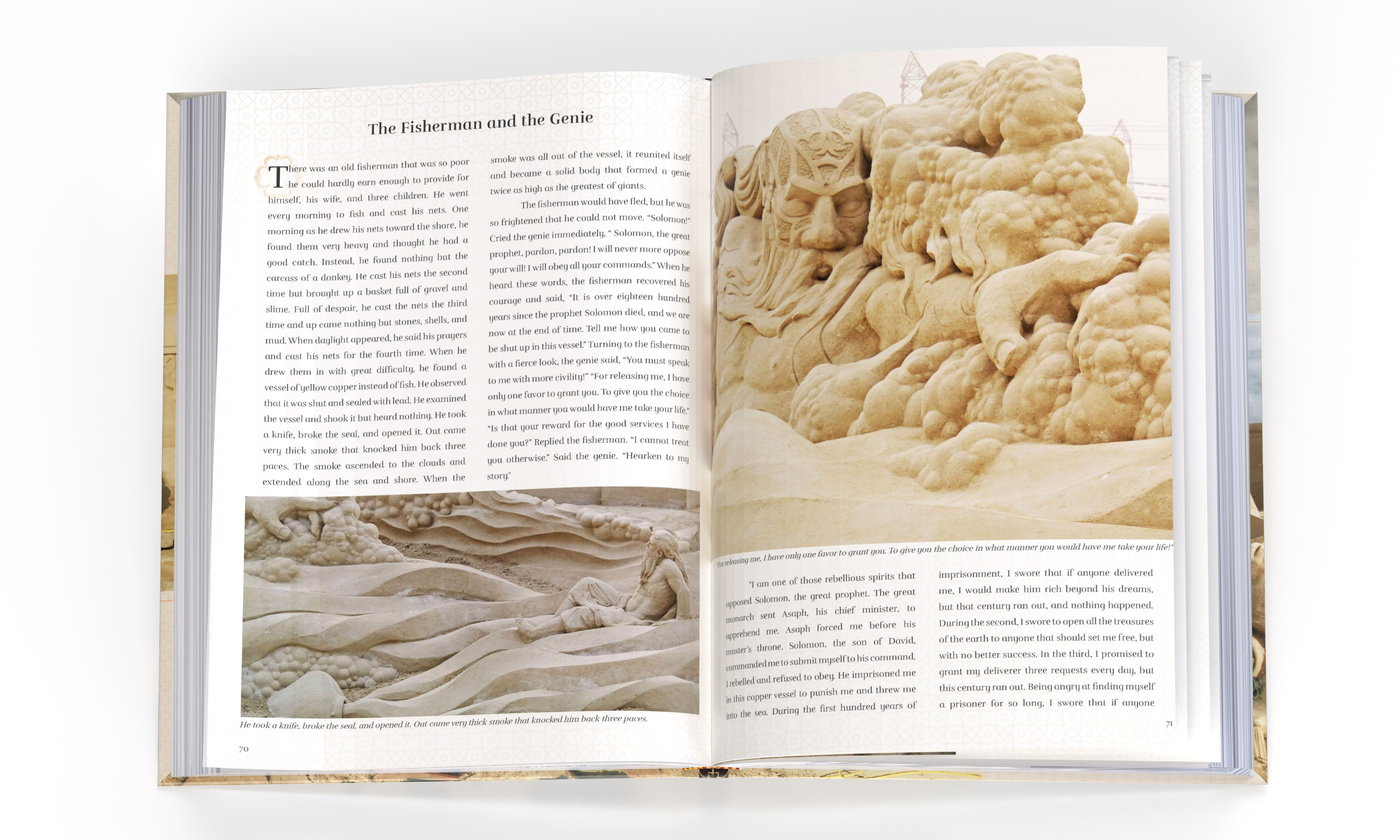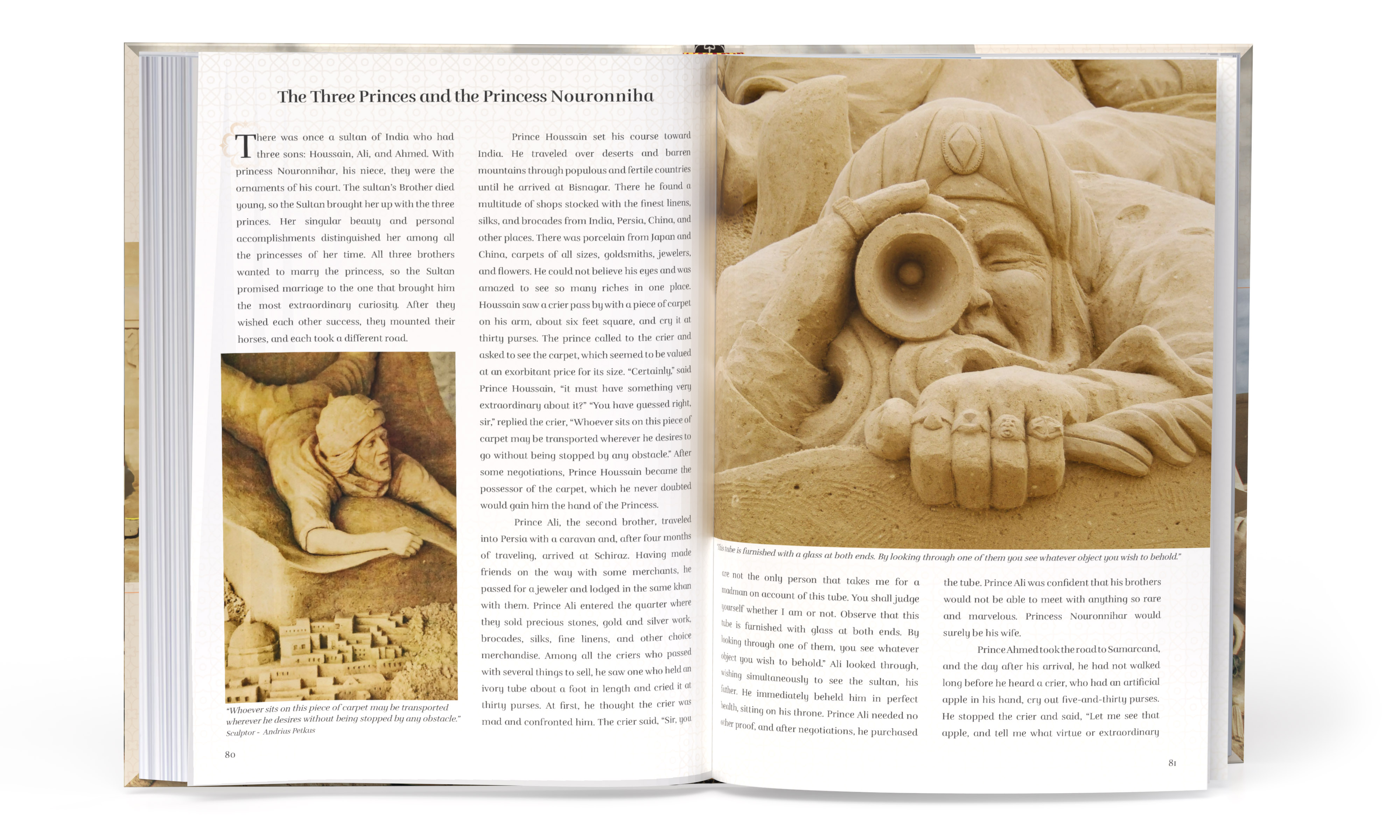 It really is truly both. Also, because the photos themselves of the sculptures are telling the story. They’re not just sand sculptures individually themselves, the sculptures are representing scenes from the stories. They were intended to be like panels of a graphic novel. The sculptures were representing some moment in the story, or some thematic element of the story. Like a graphic novel, the photos and the stories are not separate, they play off each other. It is both a photo book of the sand sculpture and a storybook on the Arabian Nights.