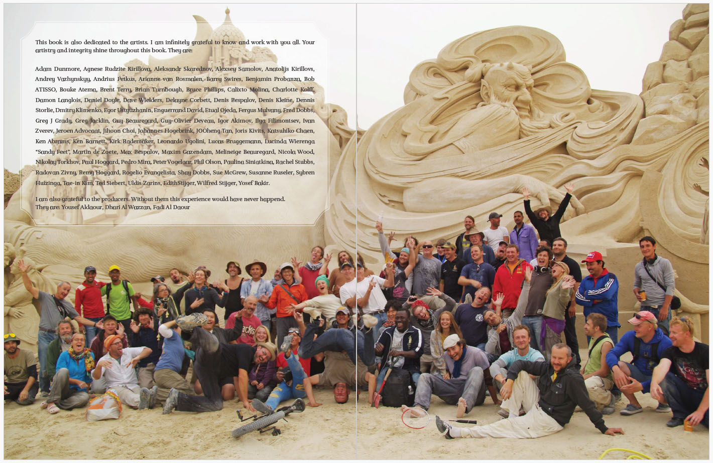 Ted Siebert from the Sand Sculpture Company. I would not be involved in this project if it wasn’t for him. We worked together for decades, and we partnered a lot in these big projects. I tend to the front-end design and engineering on our projects like when we worked together on the tallest Sandcastle in the world in 2015. He likes to carve and let me do the overall direction. This whole project wouldn’t have happened without him. Also, Yousef Aldaour. He was the lifeblood of the Remal Festival where these sculptures originated. He was the starting vision of that event. Then all the artists themselves. There are too many to name here, but they really did shine on this project. They are all credited in the book and some of their best work they have ever done is captured with these pages. This is another reason for making this book is to give back to them and to the community of sand sculpting that has given me so much. To showcase this art in its highest form. This many sculptors, working together to make something at such a scale is truly unique. A lot of people just don’t get a chance to witness this. This book really pays tribute to the sand artists that worked on it