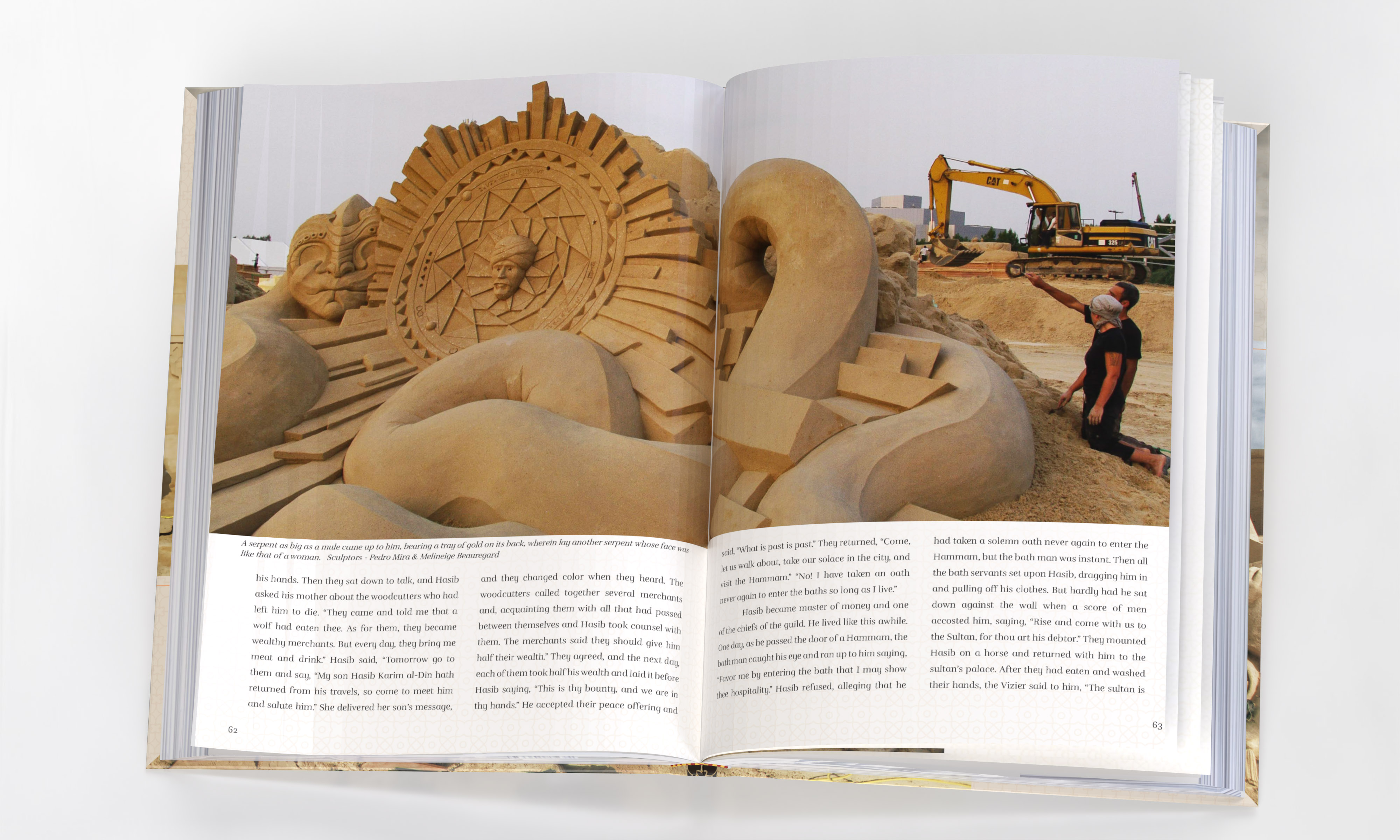 I was the creative director in charge of the artistic visioning of the largest sand sculpture park ever created called the Remal festival in Kuwait. It’s theme was the Arabian Nights and I had the idea to have a book like this at the event. Like a program guide, adding the background to the sculptures the viewer would experience in the park. With this the visitor could be looking at the sculptures and know what story from the Arabian Nights they were depicting. Of course, someone reading it all while visiting the event was not going to happen, but they could take this book back with them and be able to really absorb these stories over time. This event program never materialized. At the time I had written these versions of the stories, it was mostly to inform the artist about their sculpture assignments. I had this written material for years, hidden away. As the ten-year anniversary of the event approached, I decided that I was going to actually turn this book into reality, now illustrated with my photographs from the sculpting of this park. I started about a year ago and once I had some sample pages and I was compelled to finish it since this format really conveyed the cinematic nature of this production. It was a better format to take in what we created. We put so much creative energy into this park. It was a million-dollar production with seventy-two of the best artists in the world. When it was sculptures visited live the public only enjoys them for a brief period. With this book, you can look at these sculptures, look at the photos, read some stories and come back to them time and time again. This book did this work of art the presentation it deserved and could let more people appreciate it.