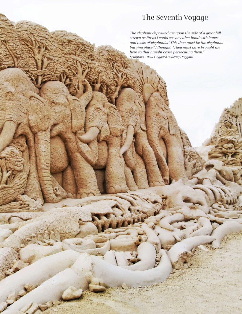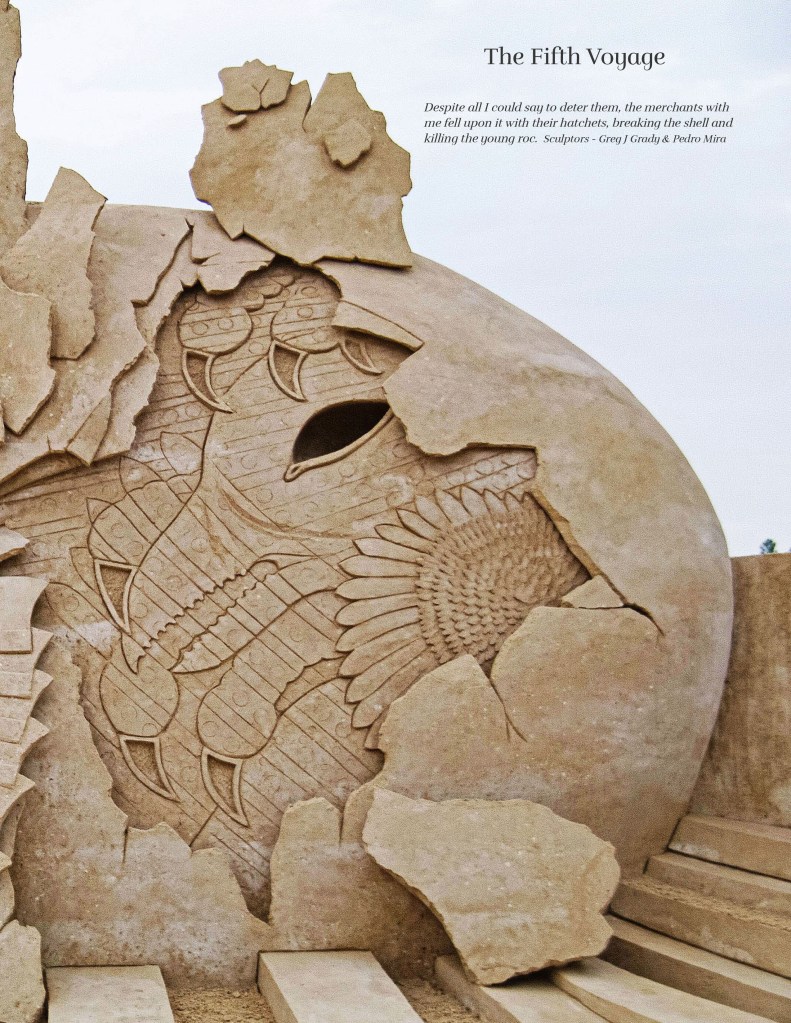 One, it shows the scale of these sculptures. Two, also gives you a feeling that this was made by a group of artists, and the camaraderie, and grit in overcoming the challenges that we had to face to make this park a reality shine through. I have added short stories of our adventures into the mix of Stories In Sand. For instance, one of the stories is called “The Storm.” Where I tell our tale of this sculpture park being created at a massive scale and halfway through being impacted by a three-day rainstorm that decimated the park. You are going to find an amazing art book on sand sculpture with these short versions of the Arabian Nights entertainments, but also our story making this park.