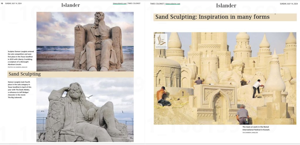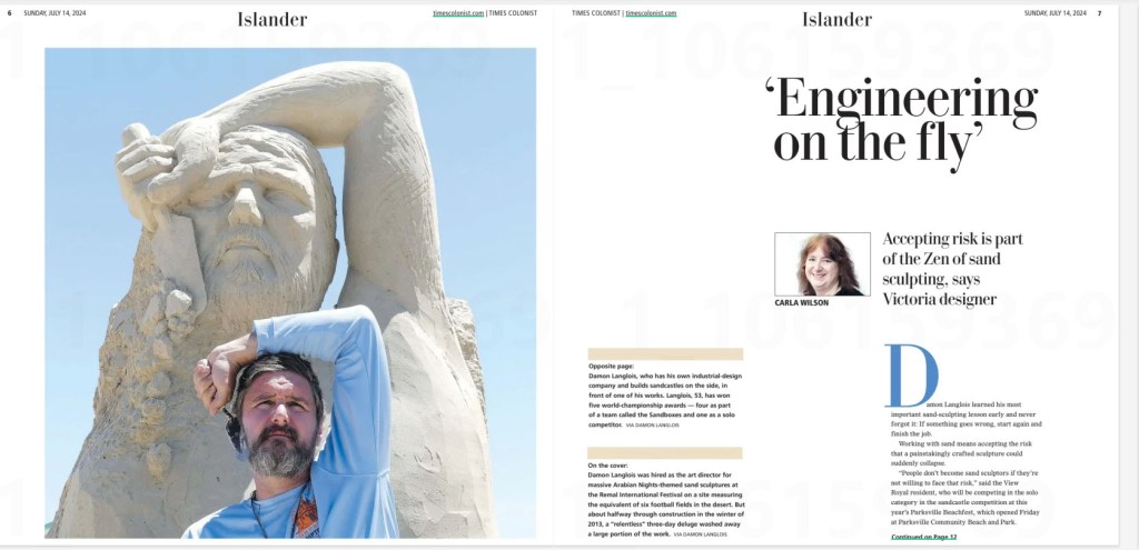 I’m Damon Langlois and I’m a sand sculptor, product designer that comes from Victoria, British Columbia, Canada. I have been both a designer and sculptor for my entire creative career of thirty years. Now I can add author to that list with my new book “Stories In Sand”.