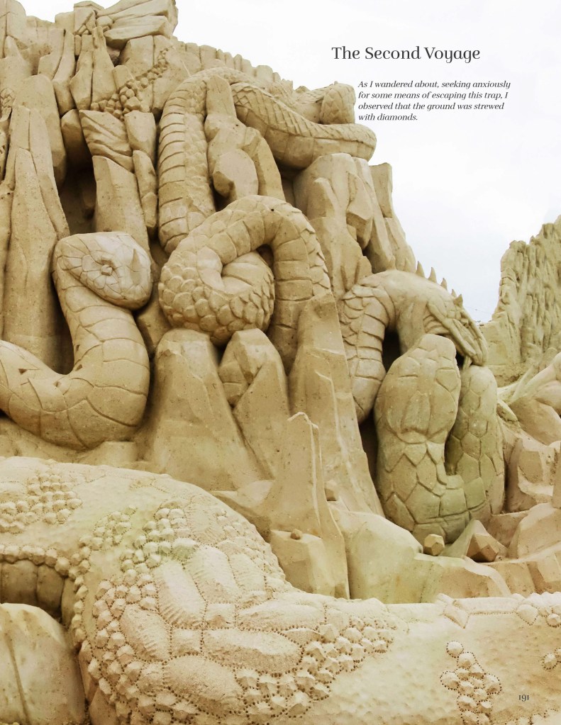 We didn’t organize it, but the Sand Sculpture Company was contracted to do the sand sculpture aspect of the Remal Festival, Sand Sculpture Park in Kuwait. As the creative director, I went into a deep dive with the stories from the Arabian Nights because I wanted to understand the theme in a deeper way, and I ended up rewriting the stories I chose so I could use them to inform the artists were going to do the actual sculptures of the stories. I wanted to give them a story summary so that they could put their heart and souls into their sculpture and not just execute a design. So, this project stems from my work of doing the design and directing of the Remal Sand Sculpture Park. Then, during the actual sculpting of the park, I took photographs of all the work. My intention then was to document what was my aspect of the project, the design and directing of it. This book stems from both those photographs, but also those rewritten stories in their shorter form.